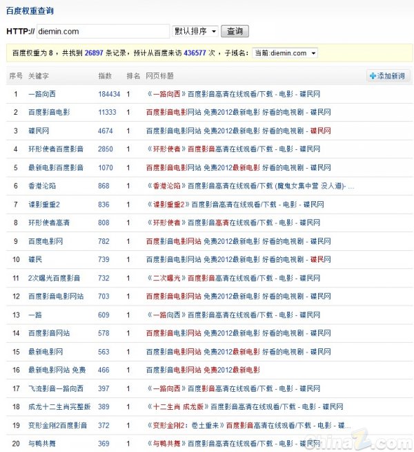 据了解,乌云报告平台所指的黑帽作弊网站,实际是一家名为“碟民网”的电影网站,通过站长工具查询该网站的百度权重,可发现此网站的众多热门电影搜索关键词均在百度搜索排名第一位(超过250个),百度权重数值高达8,而网站日访问量估算约在50万IP左右。