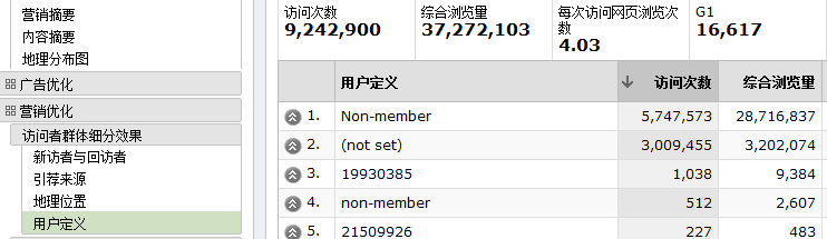 在”营销优化”>”访问者群体效果”>”用户定义报告”中查看每个自定义用户群体的转换行为。另外,根据访问者群体,您还可以使用许多其他报告来交叉分析数据。要进行交叉分析,请点击”分析选项”按钮,在大多数报告中,该按钮位于条目的最左边。选择”用户定义”查看您自定义的用户群体。比如下面是利用setvar将用户ID灌入Urchin中: