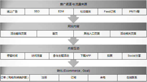 但网站分析工具中的数据量非常大,你可能一不小心就淹没在数据的海洋中,你得有一个明确的分析思路,知道要利用哪些报告或哪些报告视图才能帮助你快速找到问题的答案。以下是网站分析中涉及到的数据模块,这也提供了一个网站数据分析的大概思路。