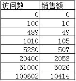 这里举个电商的例子:电子商务的转换率是一定的,网站访问数一般正比对应于销售收入,现在要建立不同访问数情况下对应销售的标准曲线,用来预测搞活动时的销售收入,如下所示: