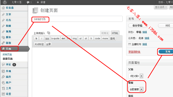 1、请在您的主题文件中,找到search.php文件,复制我们记录下的完整代码到search.php文件中,并在主题后台新建search页面,使用搜索模版,并发布页面。
