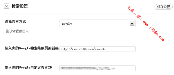 2、如果主题控制面板中有搜索控制选项,则到主题控制面板中填写搜索引擎的唯一ID和Google搜索结果页面链接,设置完成后即完成了Google自定义搜索与WordPress完美给合。例如我的是http://www.***.com/search