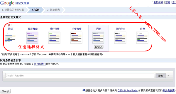 3、选择或自定义样式。这里的每一款样式您都可以选择,选择后在“试用您的搜索引擎”中可以即时的显示效果。选择好后点击下一步。