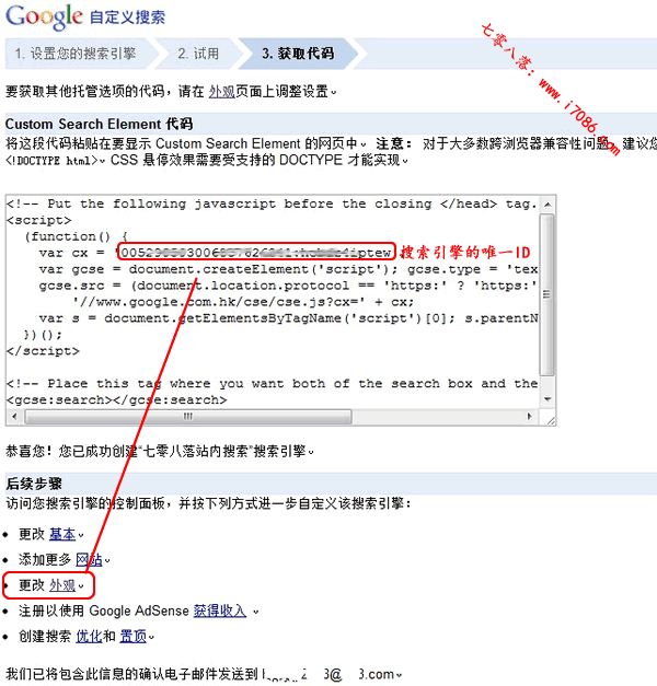 4、进入获取代码页面。提示“恭喜您!您已成功创建“**站内搜索”搜索引擎。”,请一定记录下搜索引擎的唯一ID。是否结束了??NO,我们还需要进行“后续步骤”的设置,否则你无法使用。在这里我们先选择“外观”进行设置。