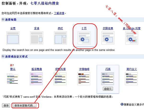 1、选择“外观”后,实际上我们进入了Google自定义搜索的控制面板。控制面板-外观→选择布局。这里我们需要选择2页式布局,否则搜索结果无法再新页面打开。切记点击保存并获取代码,复制完整代码并记录下来。