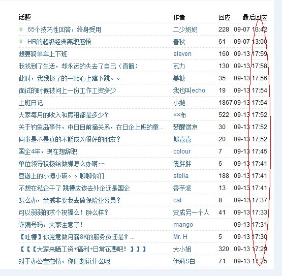 这是这个小组前面帖子的一个截图,从图中我们可以大体了解到成员们发哪类的题目和最后回应的时间,时间上看出这个小组更新速度快,小组活跃。(选择不错的一个依据点)