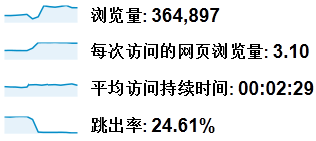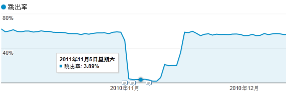如果你的网站跟踪代码没配置正确,你可能会看到不准确的或很奇怪的跳出率数据。例如,如果用户从着陆页A进入网站上另一页面B,但A和B页面上配置的是不同的跟踪代码,结果很可能A页面(甚至B页面)的跳出率数据将是有问题的数据。这些页面之间的浏览原来为一次会话,但在这里被中断为两次会话,从而令A页面作为着陆页面的访问增加了一次跳出。另 外如果你不小心地给页面加了两段相同的跟踪代码,或是使用了框架页面(即页面通过iframe或frame进行的嵌套)且父页面和子页面如果都加上了跟踪 代码,这样页面在加载时跟踪代码会被执行两次,页面浏览量会算为两次,这样访问不会被算为跳出。当你看到你的网站有超低的跳出率时(低于10%甚至接近 0%)不要高兴得太早,很可能是代码配置不当导致的,下图为一个跟踪代码重复配置的例子,使得跳出率几乎降至0%,同时其他的度量也会表现得很异常,页面浏览量会翻倍,单次浏览访问的页面数会有明显增加,平均访问时间也会有所增加。保证跟踪代码配置的正确性很重要。