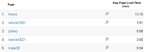 看过统计学的朋友都知道平均值是靠不住的,假设有10个用户,9个加载速度是1秒,一个是191秒,这时得到的平均加载时间是:20秒,很显然这儿的20秒是没有意义的,我们需要看明细,GA考虑到了这个问题,支持在报表页点击:效果(Performance)标签,查看明细的信息: