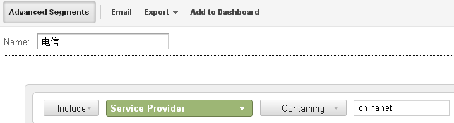 而网络运营商对于网站加载速度的影响,要用细分来做,目前中国主要运营商有:电信和联通,分别占据南北市场,电信的服务器提供商名会包含:chinanet,联通会包含:unicom,以电信为例,新建一个细分:
