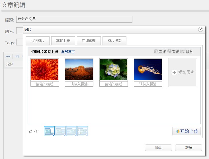 文章编辑中的内容编辑器用了百度的uEditor,可以批量上传图片,太方便了