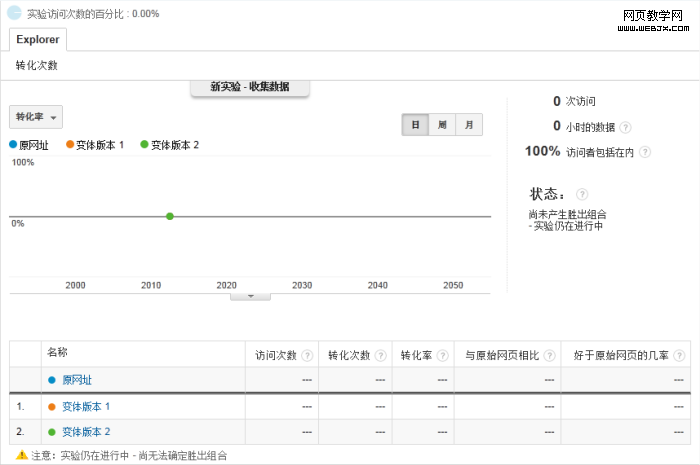 你可以点击实验并查看相关页面。在刚开始测试时实验报告里边是没有任何数据的。它需要一段时间来收集数据以确认哪个版本的页面的效果最好。具体需要多长时间,这与页面的流量相关,可能是几天、几个星期甚至两三个月。