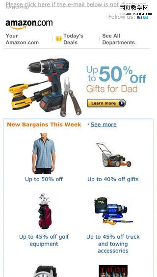 父亲节即将来临,很多在线商店都向消费者发送了节日促销邮件。下图是来自亚马逊的促销邮件,它符合了方便手机阅读的两个要素:产品列表为瘦长型,480px的宽度适合手机屏幕尺寸;白色底更好地凸显了产品图片以及文字和链接,让人一目了然。