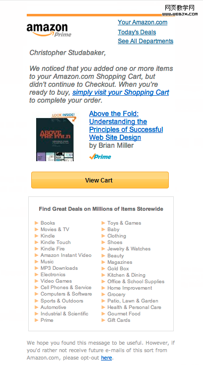 很多人都有过将商品先放入购物车,随后却没有购买也没有从购物车中删除的经历。亚马逊通过下图这种提醒邮件刺激购买。