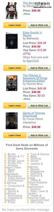 邮件内容为320px宽,网页链接清晰可见,很容易促使消费者点击查看购物车,从而刺激消费。底端的商品列表无论是在电脑还是手机上都几乎不会有人去一一点击查看,亚马逊选择在列表顶端给出一个大的黄色按钮,方便用户点击。