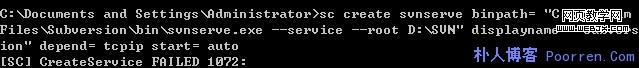 3、配置svn服务,使用sc命令建立新的service,格式为sc create svnserve binpath= "C:\Program Files\Subversion\bin\svnserve.exe –service –root D:\SVN" displayname= "svn" depend= tcpip start= auto,需要注意的是,sc命令后面参数名必须紧挨等号,等号后面必须跟上一个空格再写参数值。其他没什么问题。回车执行即可。如果执行后出现错误的提示,不必着急,打开service.msc,看看有没有名称为svn的服务,有的话回到命令提示符使用sc命令删除掉,具体如下(其中的C:\Program Files\Subversion\bin\部分为第一步保留的地址,D:\SVN为你的svn仓库地址)。