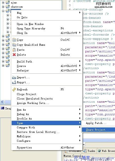 3、myeclipse中使用插件,类似于cvs,在需要共享的项目上邮件选择team,如图。