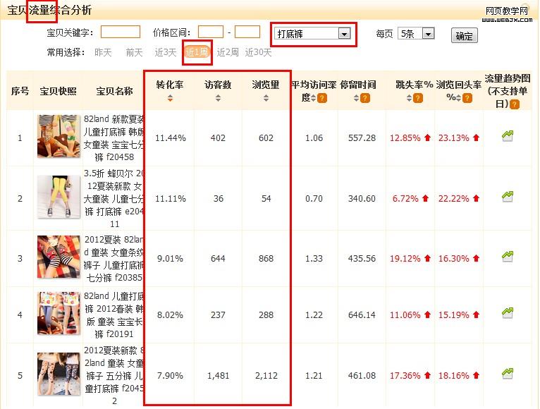这两张图分别是在打底裤类目下转化率排在前五位的宝贝的流量图和销量图