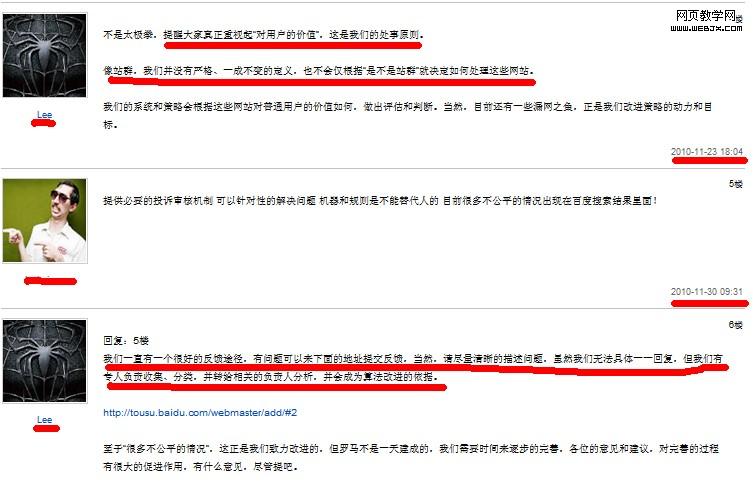 如果说,这位站长的话还过于主观的话,那么,每次面对站长关于站群问题的提问,百度搜索工程师Lee的回答几乎都是千篇一律地强调“从用户价值考虑网站建设”问题,然后鼓励站长反馈信息及举报作弊站群。这就完全可以看做是百度面对垃圾站群“有心杀贼,无力回天”的官方表态了。