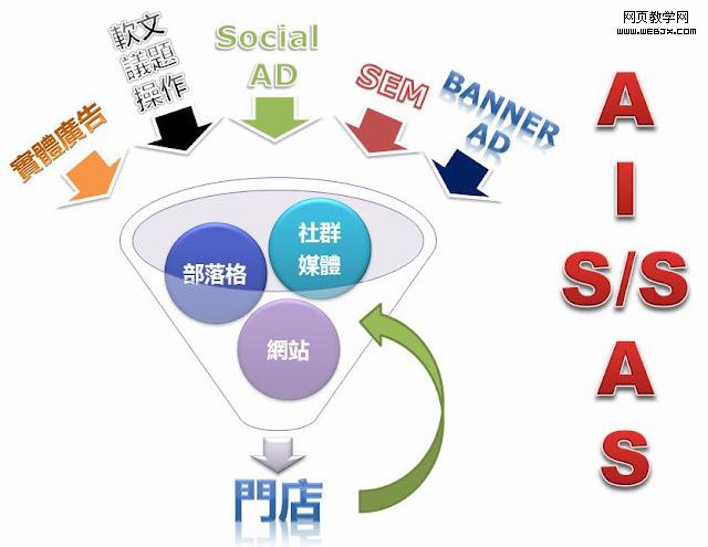 注1:原本的策略是AISAS,但是在社群的年代里面,加上近年来垃圾及业配信息太多,人们又逐渐懒得自行过滤信息,也因此Social(社会化)有逐渐侵蚀Search(搜寻)的比例之势,所以在既有的AISAS策略上多加了一个”S”。