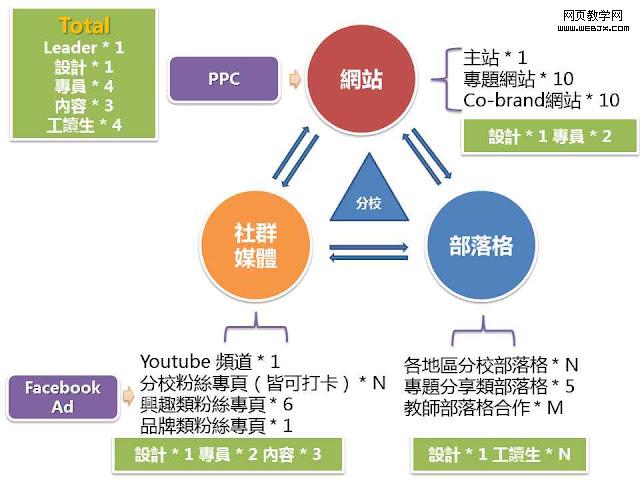 在整体系统的营销设计理念,我们还是采取”内容为王“作为主要的出发点,在负责生成内容的人力配置上我们就安排 了三个。另外分校博客负责产生内容的,则是由对网络有浓厚兴趣的工读生,以比较轻松的方式撰写,只需要分校的主管审过即可,其他几个平台则安插专员进行例 行维护及互动,这样的配置也是考虑各平台属性的不同及整体人力成本考虑而进行的配置。由于社会化媒体是一个很重内容的平台,因此所有的内容的出发由社会化 媒体作为第一站,专员再利用其内容作二次营销,但博客是属于比较轻松性的平台,所以并不需要太专业的人力,只需基础的文案撰写能力就好(不过这中间依据企 业的需求,还是有经过培训的)。