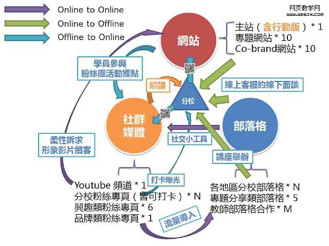 其实这张图已经阐述了整个人流跟资讯流的走向,先前我们已经讲过我们整个内容为王策略的出发点在社会化媒体上,透过社会化媒体的扩散及导流,可以将 线上的人流用实体免费活动的方式,导引至线下分校去进行收割;若当下没有收割,我们只激发了他的注意及兴趣后,潜在用户也可以透过搜索或是社会化媒体上, 获取我们更多的资讯,最终还是可以透过线上客服约访的方式,在约到线下来成交。