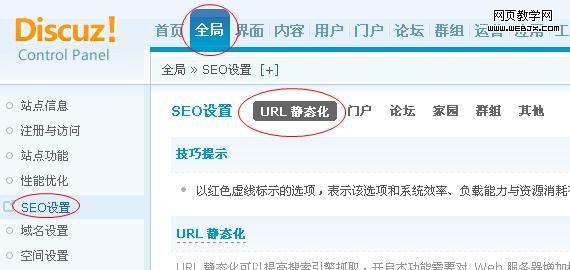 第二步:接下来,我们再来到论坛的后台,全局—SEO设置—URL伪静态,然后将里面的框框全部打勾,如下图: