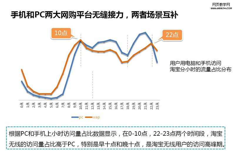 在手机购物时间方面,分享一张数据图,这两条曲线红色的是用手机购物的时间点,蓝色的线是用PC购物的时间点。