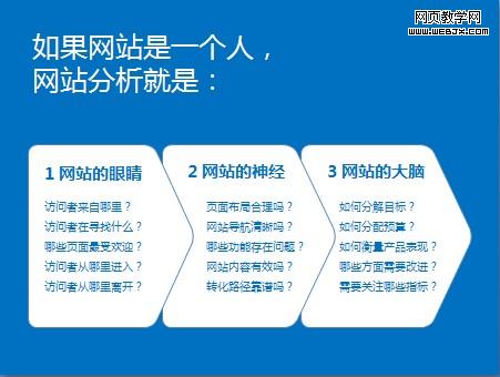 这里我们做个形象的比喻来帮助理解网站分析,如果我们将网站看成一个人,那么网站分析首先是网站的眼睛。他帮你看清网站里发生了什么事情。访问者来自哪里,他们在找什么,网站中哪些信息最受欢迎等等。其次,网站分析是网站的神经系统。他让你知道网站的健康状况,网站的哪个功能出现了问题,哪里需要进行调整,页面布局是否合理,导航是否清晰等等。最后,网站分析相当于网站的大脑。他让我们在完成目标的过程中合理分配资源和预算,并通过优化不断提高网站的表现。