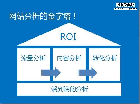 网站分析的整个过程是一个金字塔的结构。金字塔的顶部是网站的目标:投资回报率(ROI)。要达到这个目标,我们首先需要有访问者,所以第一部分是网站的流量分析。其次,我们要针对访问者的需求,有效的展示我们的内容,商品和信息。并且让客户喜欢这些内容。因此,第二部分我们要对网站的内容进行分析。内容分析涵盖的范围比较广,包括导航分析,页面质量分析等等。最后,也是最关键的部分,我们要让访问者转化为客户,购买我们的信息和商品。只有访问者完成了最后的转化,我们才能完成网站的最终目标。因此我们要对网站的转化进行分析。最后,每一个问题都不是单一的原因引起的,每一个分析也都不是孤立存在的,因此我们还需要串联整个访问和购买过程。对网站进行端到端的分析。下面,我们来逐一说明每一部分的分析方法和我们要分析的内容。