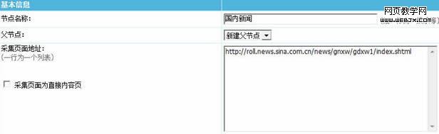 4、在节点名称框里起个名字,然后把要采集的新浪各地新闻列表地址copy过来: