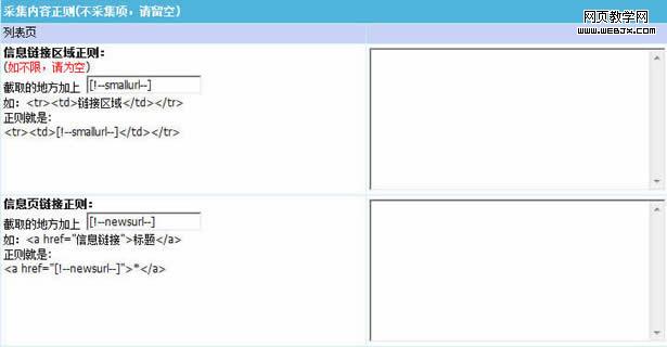 5、下来发现好多选项,如“采集页面地址方式二,内容页地址前缀。。。”先不要理他,后面再一一详解,直接拉到 “信息链接区域正则”这里:
