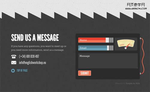那对于“联系我们”页面呢?English Workshop是一个提供英语语言学习机会的组织机构。该网站将提交反馈信息的页面设计成了机器的控制面板样式,以试图它可以更好的贴合“工作坊”的主题。