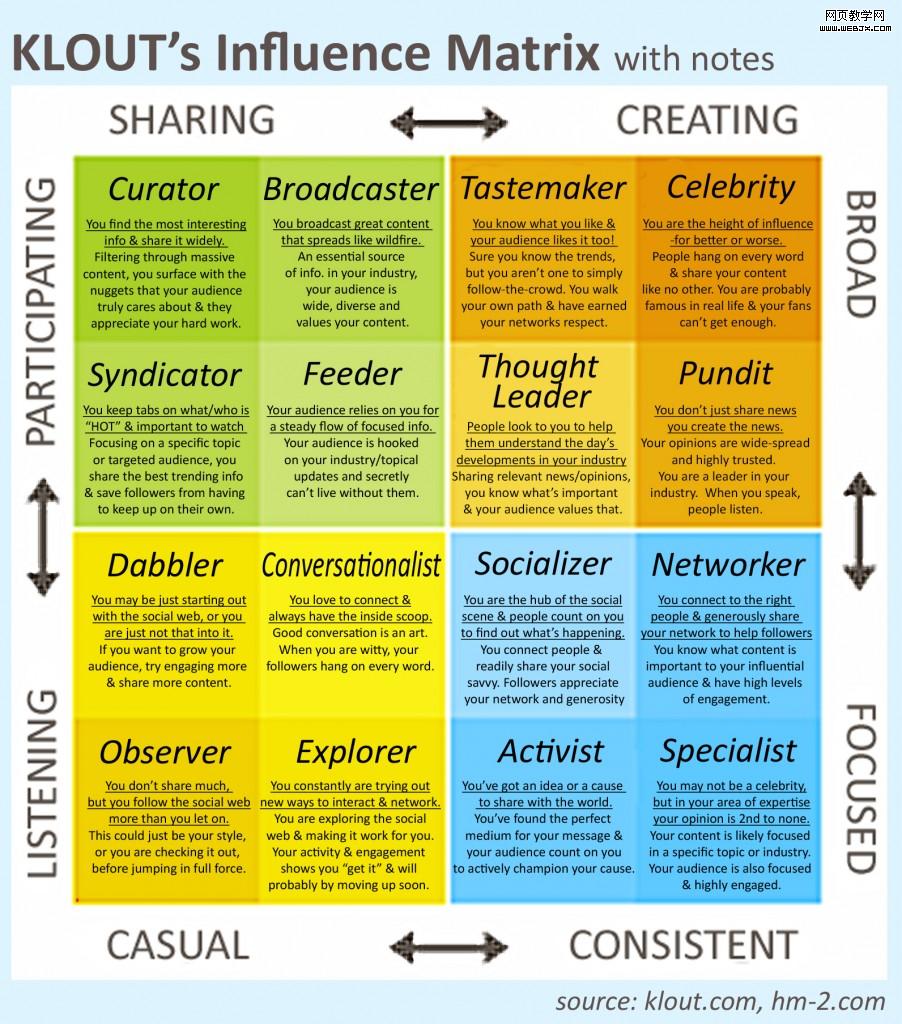 Klout的影响力矩阵提供了不少于12种不同的意见领袖,包括: