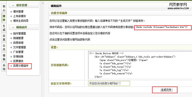 3、若安装成功,页面跳转到百度分享插件的信息页,此时您只需点击页面左侧的“百度分享插件”按钮,即可进入设置页。在此页中,您需要复制从百度分享网站获取的分享按钮代码,还可以自定义您的分享内容。设置结束后,单击下方的“生成文件”按钮保存设置。