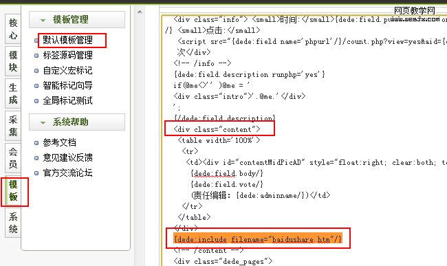 4、保存设置后,您只需在您页面的相应位置处添加如下代码即可使用百度分享按钮:{dede:include filename=“baidushare.htm”/}。以文章内容页为例,您只需要打开您站点上的文章内容页模板,在标签之前或该div之后添加上述代码即可。