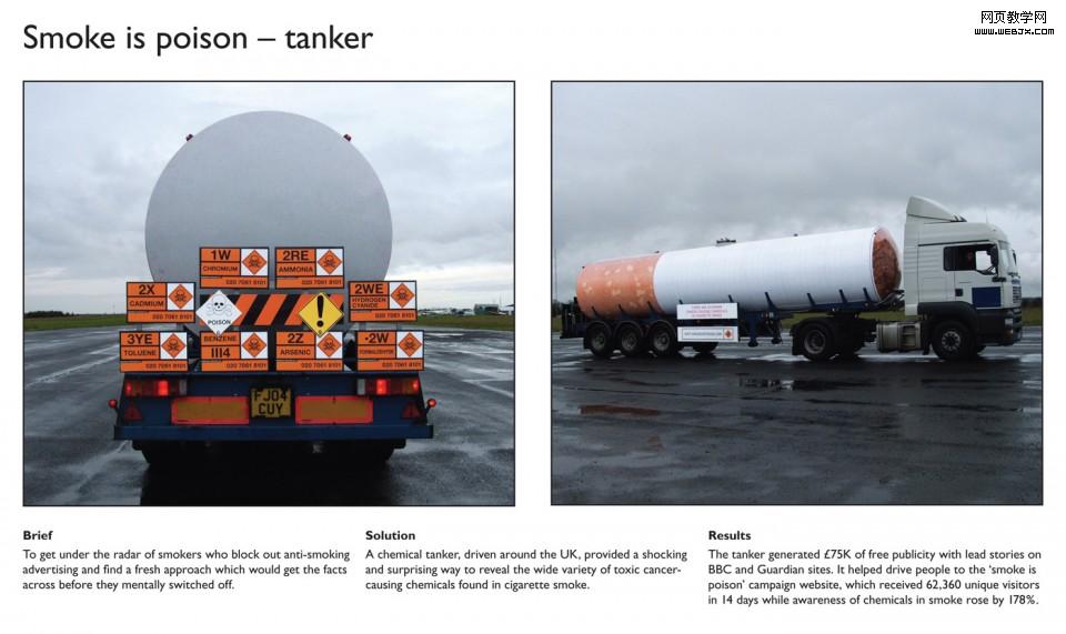 这是07年戛纳广告金狮奖作品,奥美广告为英国卫生部和癌症研究所所做。清晰直观的告诉我们吸烟对身体的危害有多大,就像随身携带一颗威力无穷的炸弹!