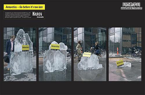 某个城市广场上放着的巨大的冰块,慢慢的融化,以小见大,警示南极州的冰川正在融化。
