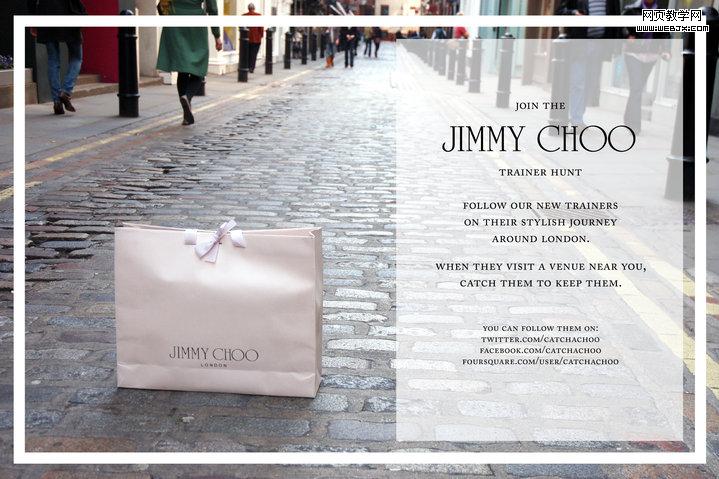 Jimmy Choo已经成为社交媒体中一个引领者,这很大程度上得益于它在2010年春季的活动 Catch-a-Choo Foursquare (美国很受欢迎的签到社交媒体),活动要求女性围着伦敦跑,作为奖励,她有机会获得一双新上市的运动鞋。Jimmy Choo使用Foursquare在不同的时尚场所来签到,签到是通过Facebook和Twitter发布,第一个到达各个签到点的人会奖励一双运动鞋。