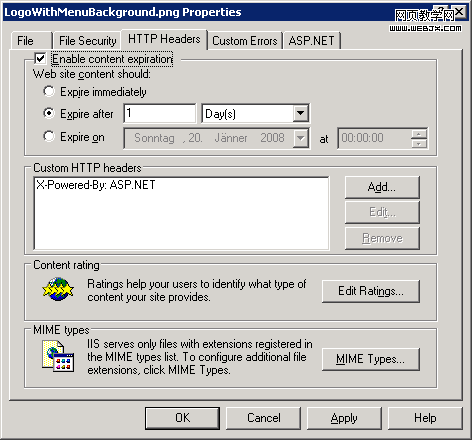 上图表明开启IIS的缓存模块,并设置过期时间为1天,也就是1天之内,用户访问这张图片时均可以从其本地的缓存副本中读取,而不必来服务器下载,当然1天之后,缓存失效,图片下载后又重新会被载入浏览器缓存中。当然这种方式需要你有管理IIS的权限,我想作为架构师的你这点权限算个皮毛啊。