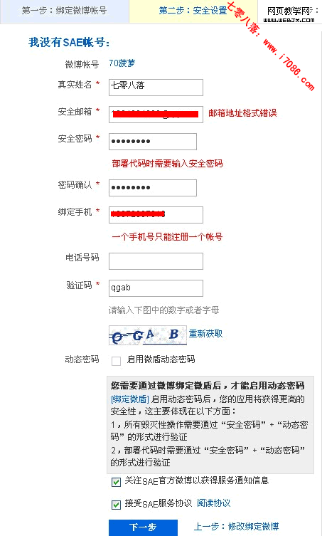 3、登录新浪SAE后,还需要进行一些资料的填写,注意手机号码和安全邮箱一定要使用正确的,因为会适应手机接受验证码!点击下一步。