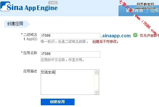 6、然后填写你的应用基本信息,并记住这里的二级域名,这个就是您博客的访问地址。