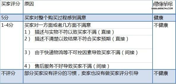 上面的表格简单列出了买家评分的几种情况和原因(直接或间接),相信很多卖家都应该有所了解,下面让我们简单来分析一下描述低分和不评分的原因: