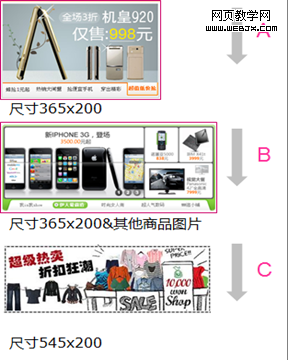 在改版过程中,首先我们上线了A版本,当A版本改版至B版本的时候,banner的尺寸相对阔大,而其中商品图片内容也增加,因此我们认定上线后的表现一定会优于A版本,结果发现完全不是这样,B版本反而比原来A的转化率下降了不少,一开始我们以为是否因为新版本上线导致老用户不习惯于新设计造成一些操作中的困扰,但是发现过了1个月数据仍然无很大起色。于是我们上线了C版本,索性加大了单个banner的尺寸来查看数据表现,果然这次数据不仅优于B也优于A表现。