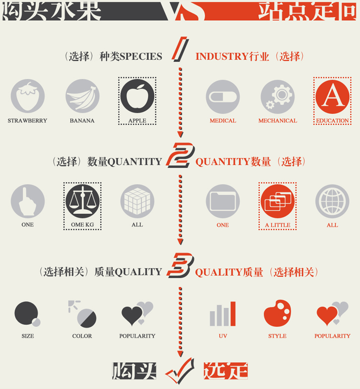我们发现站点定向与购买水果有着惊人的相似(见上图右侧),在站点定向时,行业、数量以及质量往往是选择推广载体站的主要考虑因素,是投放在医学、机械、还是文化教育类等网站?是选择一个、多个、还是全网投放?在确定这些选择后,往往还会对网站的大小、风格、及受欢迎度进行综合分析,最终实现选择后进行投放。这个选择的过程是通过推广物料的属性、广告主的需求及成本等因素考虑的。