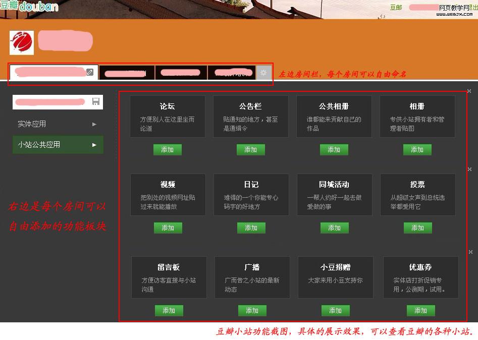 如果你想经营一个品牌形象,那么不要忘了创建一个小站吧。如果说小组是论坛,那么小站就是主题网站。在这个小站里,可以随心所欲的发布相关产品,促销,新闻等等。下图是小站相关功能的截图。(为了避免做广告嫌疑,笔者的小站信息已经屏蔽)。