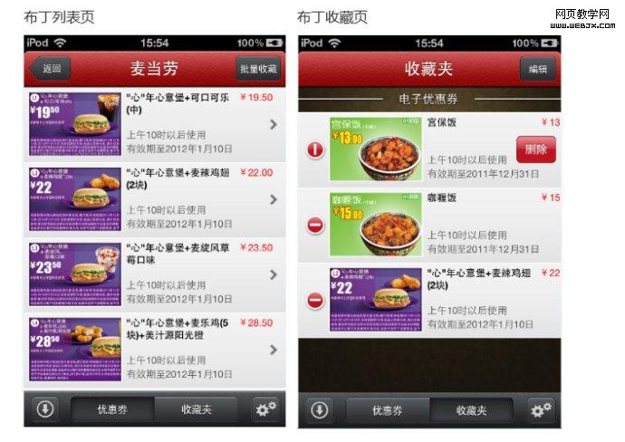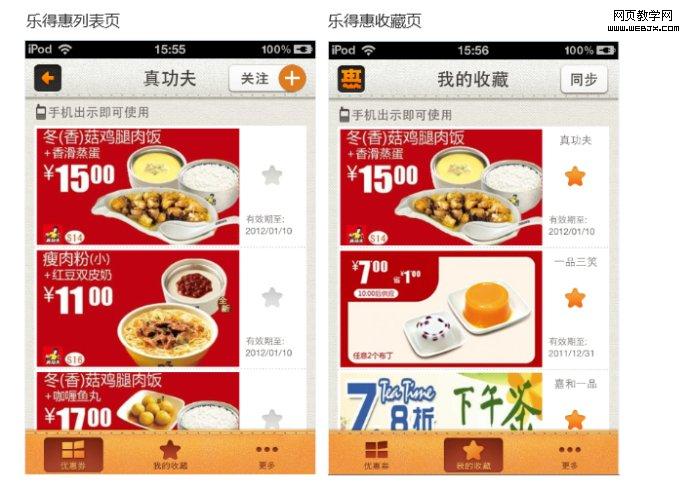 在不同的页面,针对同一性质的操作,应保持一致性。比如下面这两个应用在功能上非常的接近。由于列表页上的细微差别(上面的需要在下一级页面执行收藏操作;下面的可以在当前列表页执行收藏操作),导致两者在收藏页面的交互形式有较大的区别。当然,下面的应用可采用和上面的同样的删除形式,但却不如现在的方式直观。