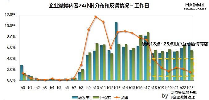 当第一部分的文字、图片、视频和链接都准备就绪后,接下来就是发布这些内容。首先是发布时间的选择,微博用户活跃的高峰是中午休息和晚上下班回家过后,这两个时段是微博也是SNS网络的黄金时段,如果微博定位偏娱乐性质,这两个时段更不能错过,这里贴上前段时间新浪发布的企业微博活跃用户时段分布供大家参考(数据来源:199it)。