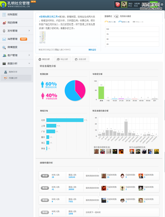 孔明的亮点在于可以锁定某一条微博对于“跟踪”,分析出其传播路径,多重传播分别覆盖人数等,这对于微博营销者来说无疑是一个利器。