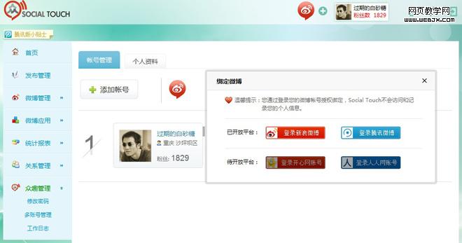 最后,它们都提供了多账号绑定功能,可以只用一个平台账号管理多个微博账号,这无疑是多账号的微博运营者的福音。想我以前最多管理近十个账号的时候,虽然装了所以平台的浏览器,平时也千小心万小心但还是出过几次错,所以多账号管理这个功能可谓解了许多人的燃眉大急。总之,这两款免费综合管理工具各有千秋,大家喜欢哪家就用哪家吧。