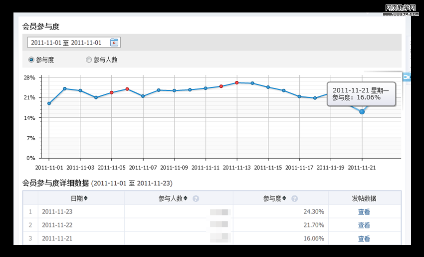 杨壁宁:例如查看当日会员的参与度的变化趋势,观察不同时期的发帖量情况,查看发帖、回帖会员的百分比,了解发帖会员的详细参与情况。